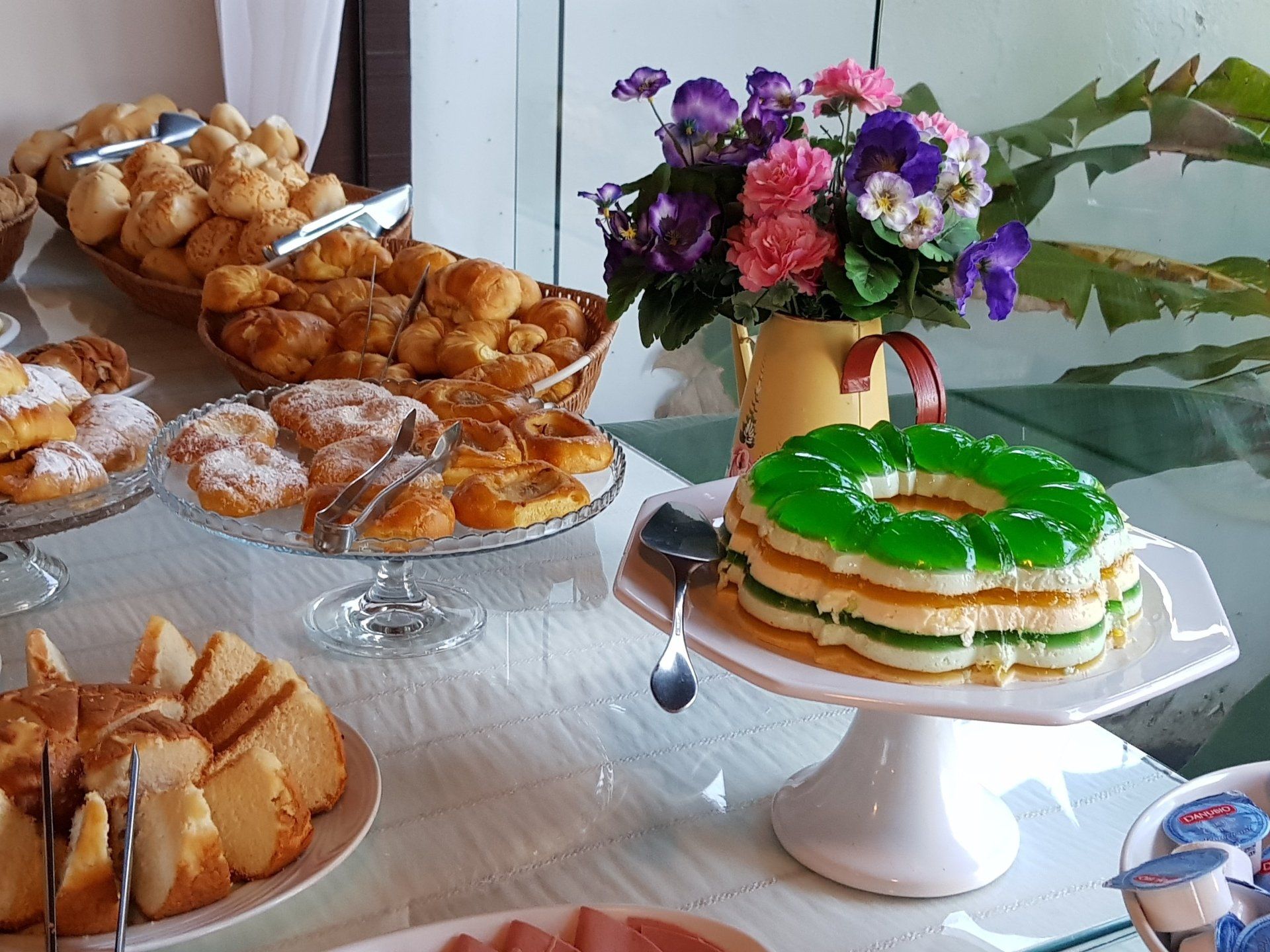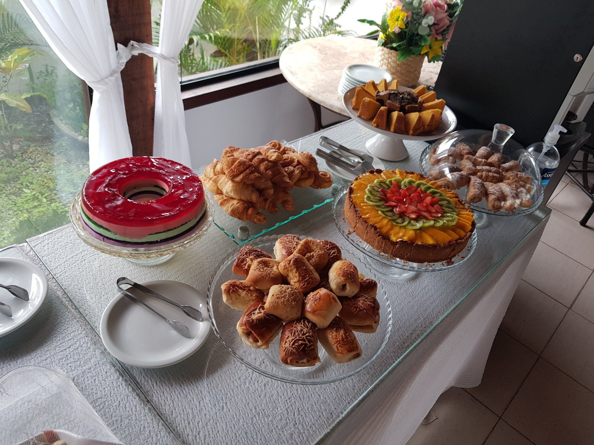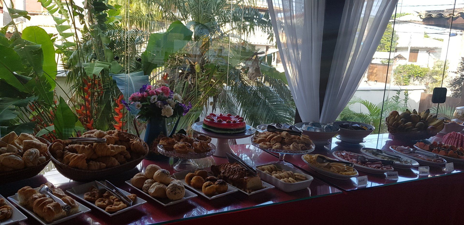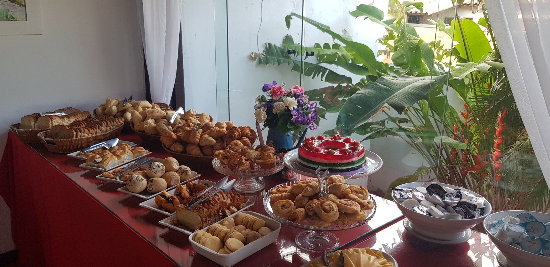 O café da manhã é servido de 7:30 - 11h e oferece bebidas quentes, sucos diversos, iogurte natural, frutas frescas, salada de frutas, pães, bolos, geleias, queijos e frios, pão de queijo, ovos mexidos e muitas outras delícias.