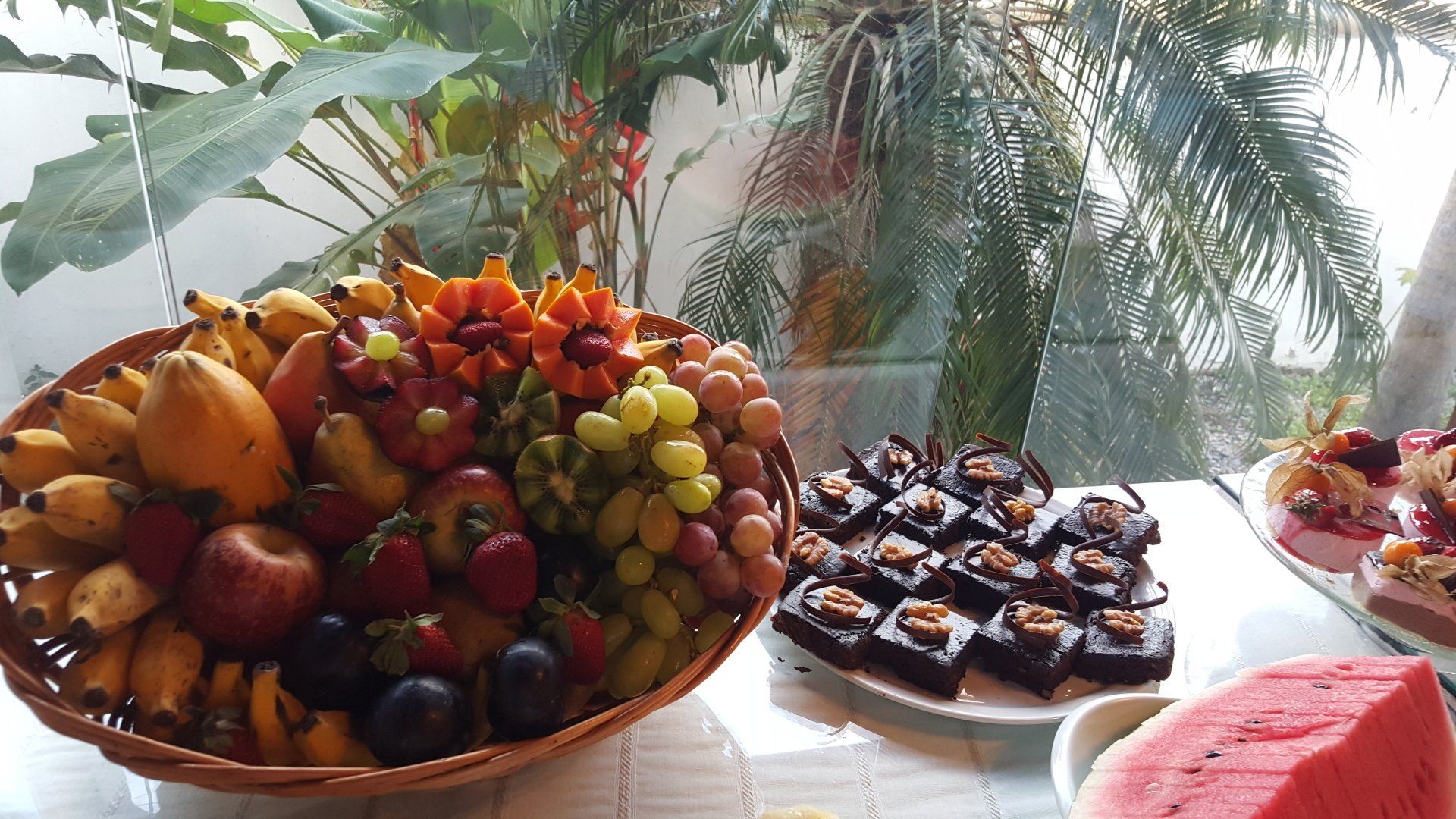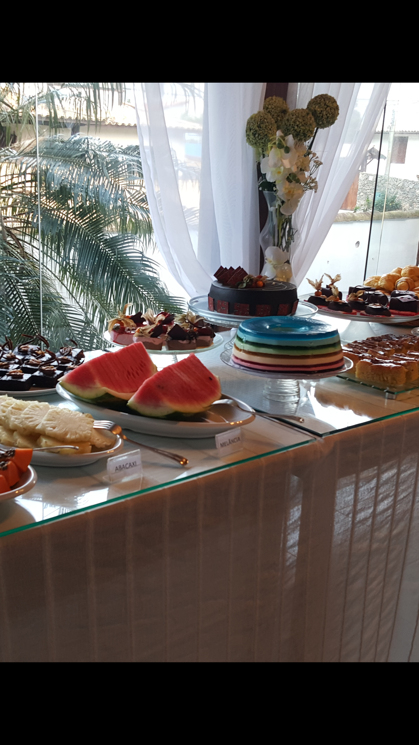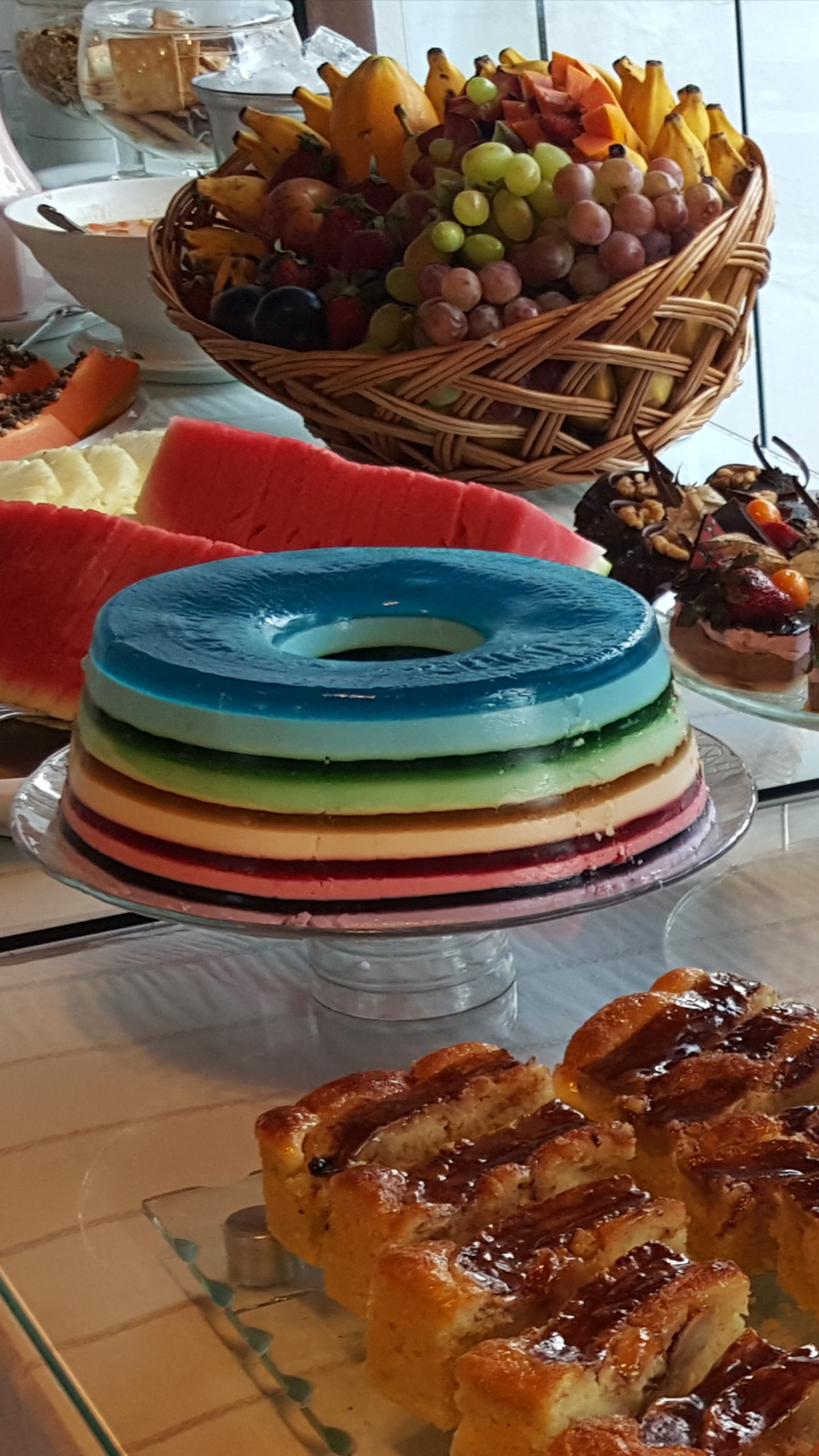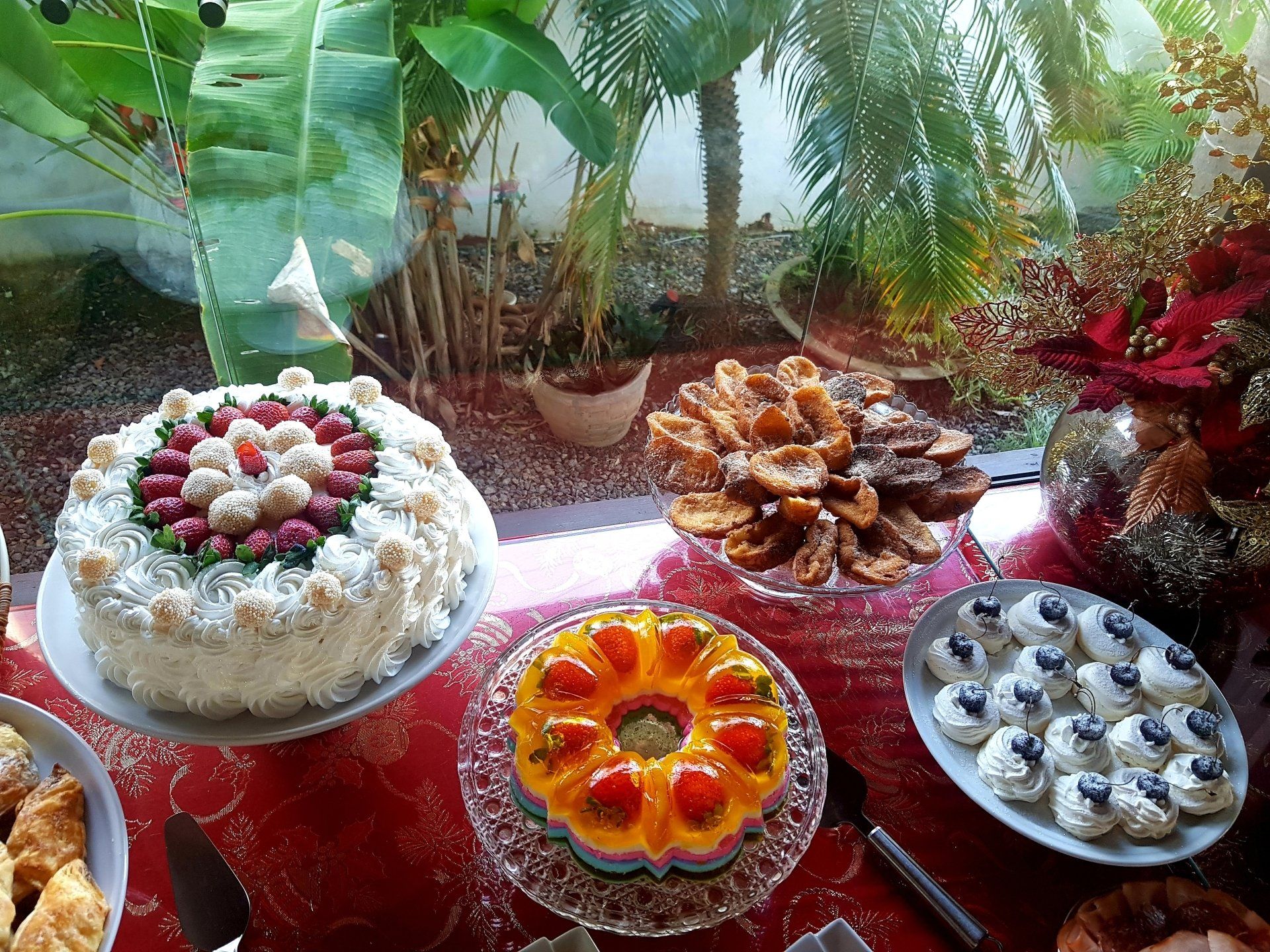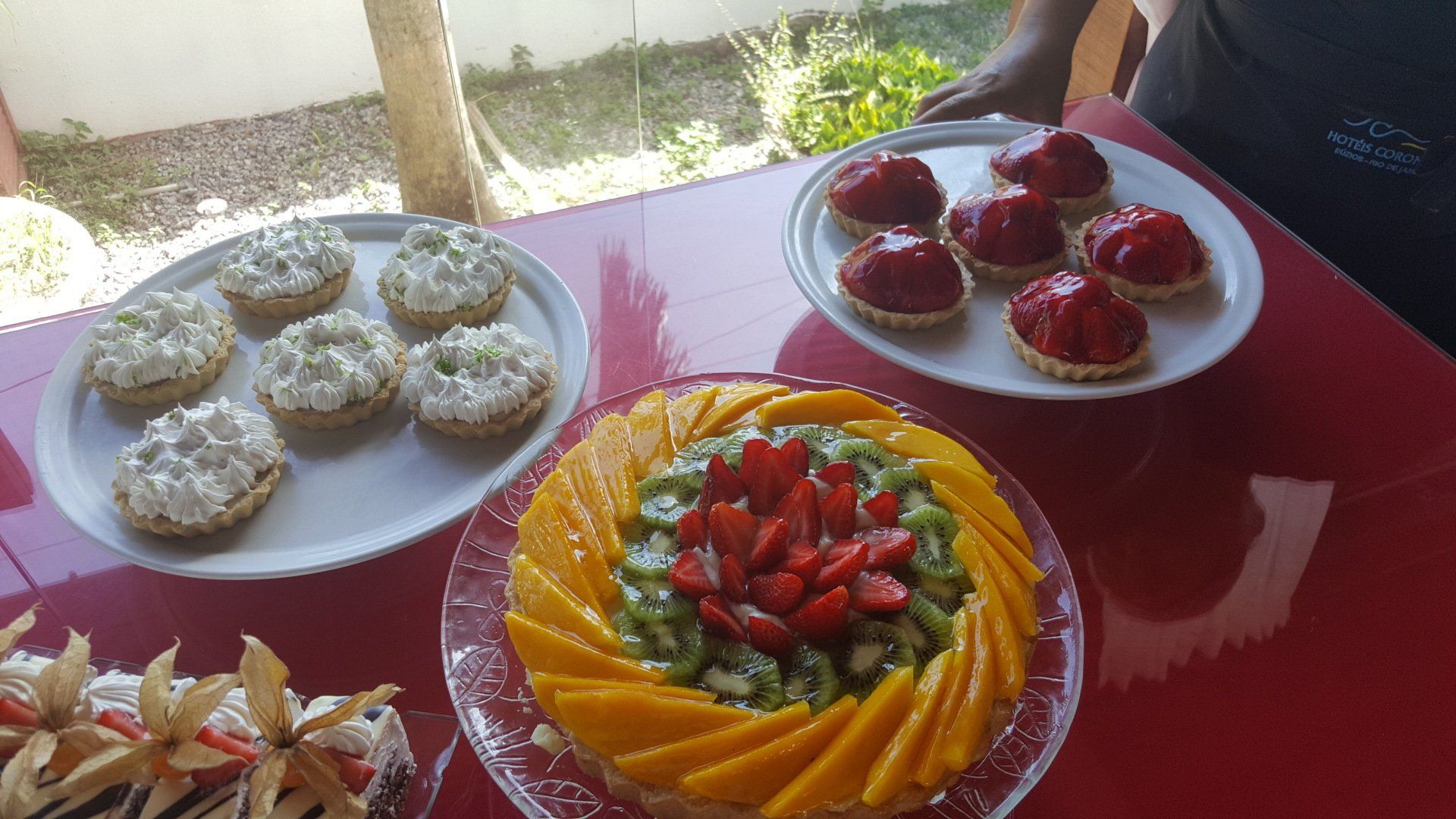 O café da manhã é servido de 7:30 - 11h e oferece bebidas quentes, sucos diversos, iogurte natural, frutas frescas, salada de frutas, pães, bolos, geleias, queijos e frios, pão de queijo, ovos mexidos e muitas outras delícias.